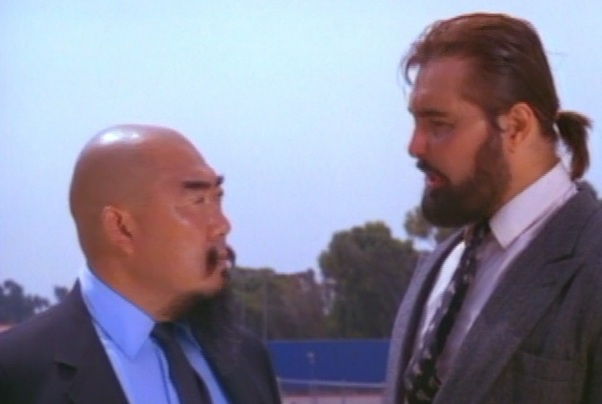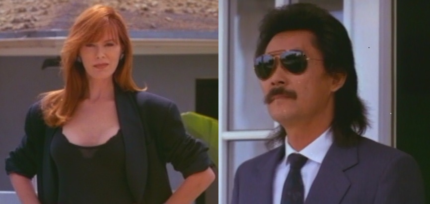 Highlights include a vague threat about putting someone’s head on a piano, a Z’Dar sex scene, an Okamura sex scene, the fact that Okamura plays a character named “Okamura,” hot nurse dirty talk, a church kidnapping that leads to sex (chicks dig kidnapping, right?), “Shoot! Shoot him!,” sex in your undies, retarded patriotic diatribe in a restaurant, unnecessary Maitre D’, sped-up sword fights, a Yakuza boss with a sweet mullet and John Oates mustache, hot oil crotch fighting, and America’s favorite drinking game – SPOT THE WIG!