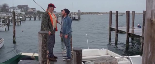 JAWS is a movie with a fair amount of humor, but this is unquestionably hands-down the funniest line and, with respect to Robert Shaw, the single funniest performance in the movie. The comic Pete Davidson has a very good bit about how a moment this broad and bizarre could have possibly ended up in a movie this finely controlled. I won’t spoil the bit, but Davidson’s conclusion is that it’s just a delirious accident. I have to admit, it’s pretty goddamned incongruous. And who is Dick Young? He’s not a professional comedian. You pull this guy off a lobster boat and all the sudden, he’s Curly Joe DeRita. Pete Davidson says this moment doesn’t belong in the movie. Sir, I disagree. The answer is in the form of a question: Do you wish this moment had been cut?
