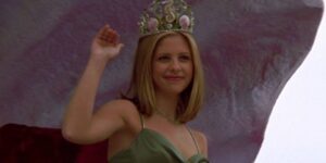 What’s sort of funny is that Hewitt and Gellar, as much as they had star personas at that point, were sort of trading them up. Helen Shivers is the pageant queen, the girl everybody wants to be with or be, which if you had asked every other guy I saw the movie with in 1997, would have been Jennifer Love Hewitt. CAN’T HARDLY WAIT, a year later, is built on this persona. Then again, this isn’t exactly Belushi and Aykroyd in NEIGHBORS: If you remember, Buffy was a cheerleader before getting more serious and becoming a Slayer. And it’s not like Gellar can’t play the role. With respect to Mr. Prinze Jr., she sure looks like a pageant winner in the movie.